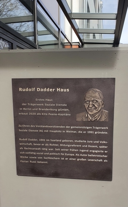 „Zu Ehren des Vorstandsvorsitzenden der gemeinnützigen Trägerwerk Soziale Dienste AG mit Hauptsitz in Weimar, die er 1991 gründete. Rudolf Dadder, 1941 im Saarland geboren, studierte Jura und Volkswirtschaft, bevor er als Richter, Bildungsreferent und Dozent, später als Rechtsanwalt tätig war. Seit seiner frühen Jugend engagierte er sich vielfältig sozial und politisch für Europa. Als Autor belletristischer Werke sowie von Sachbüchern ist er einer großen Leserschaft als Florian Russi bekannt.“