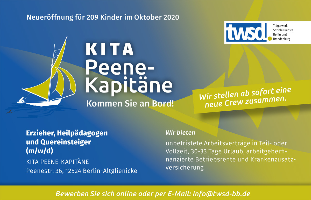 Die im Jahr 2020 neugebaute Kita Peene-Kapitäne mit 209 Plätzen befindet sich in Altglienicke, einem Berliner Ortsteil im Bezirk Treptow-Köpenick.