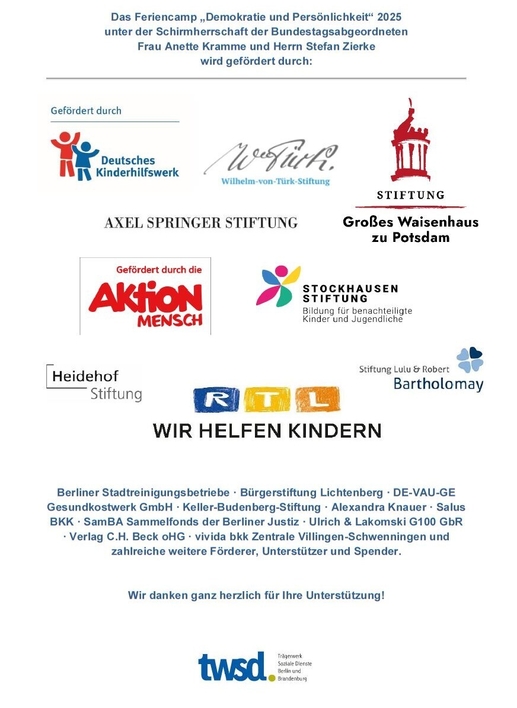 Das Feriencamp "Demokratie und Persönlichkeit" 2025 wird u.a. gefördert durch die Stiftung RTL - Wir helfen Kindern e.V. und die Stiftung Großes Waisenhaus zu Potsdam.