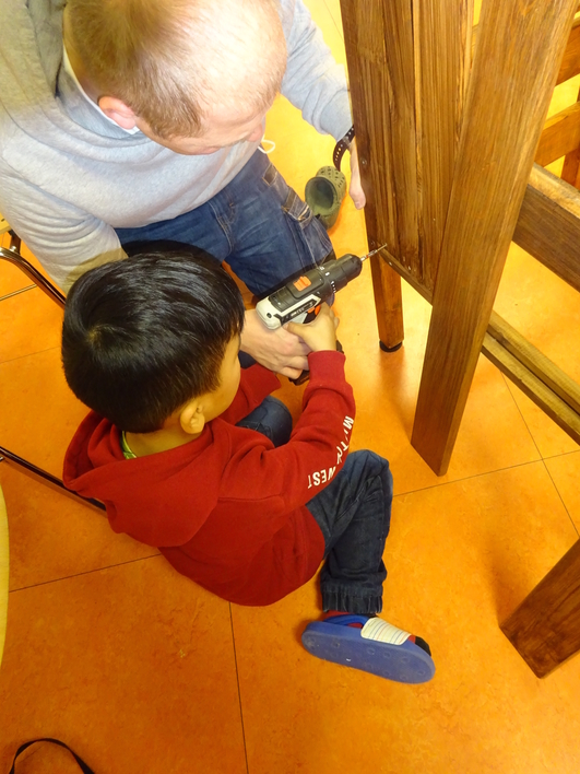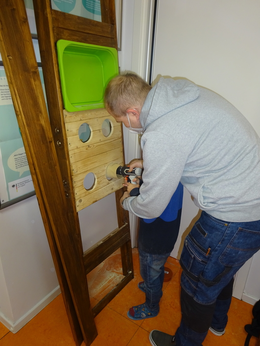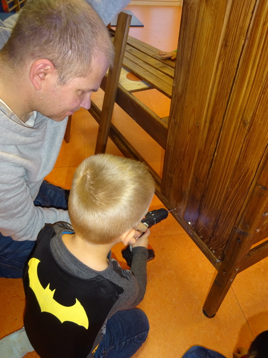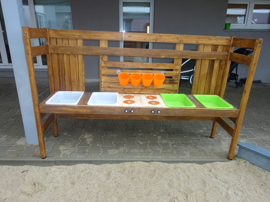 Im Krippenbereich entwickelten die Kinder und der Pädagoge Herr Austen dazu die Idee, aus einem Hochbett eine „Matschküche“ zu bauen, mit anschließender gemeinsamer Umsetzung des Projekts im Kita-Alltag. Das Interesse wuchs bei den Kindern besonders, als sie miterleben konnten, was aus der ursprünglichen Form des Holzes durch den Einsatz von Werkzeug und anderen Materialien entstand. Die Kinder hatten großen Spaß daran, sich aktiv auszuprobieren. Sie schliffen und lasierten das Holz und schraubten es zusammen. Dabei halfen die Kinder aus dem Elementarbereich fleißig mit. Mit viel Eifer und Interesse machten sich die Kinder daran, alle Teile miteinander zu verbinden. Es wurde geschraubt, bis die letzte Schraube an Ort und Stelle war und das Gerüst der Matschküche schließlich stand.